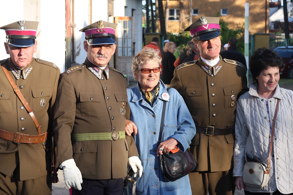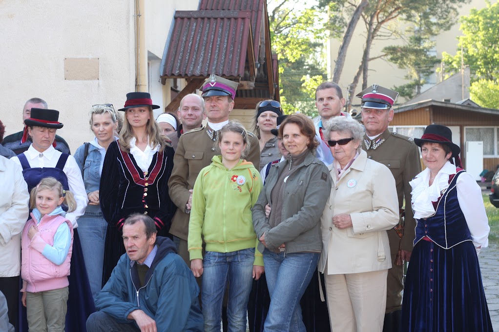 Zdjęcie grupowe uczestników Zjazdu Rodziewiczów przed budynkiem z banerem rodowym